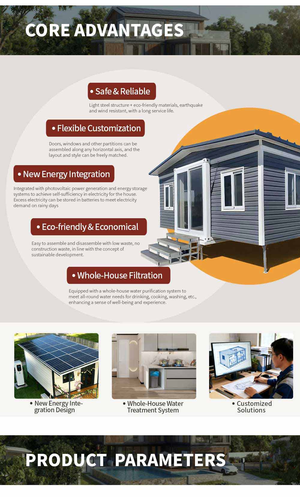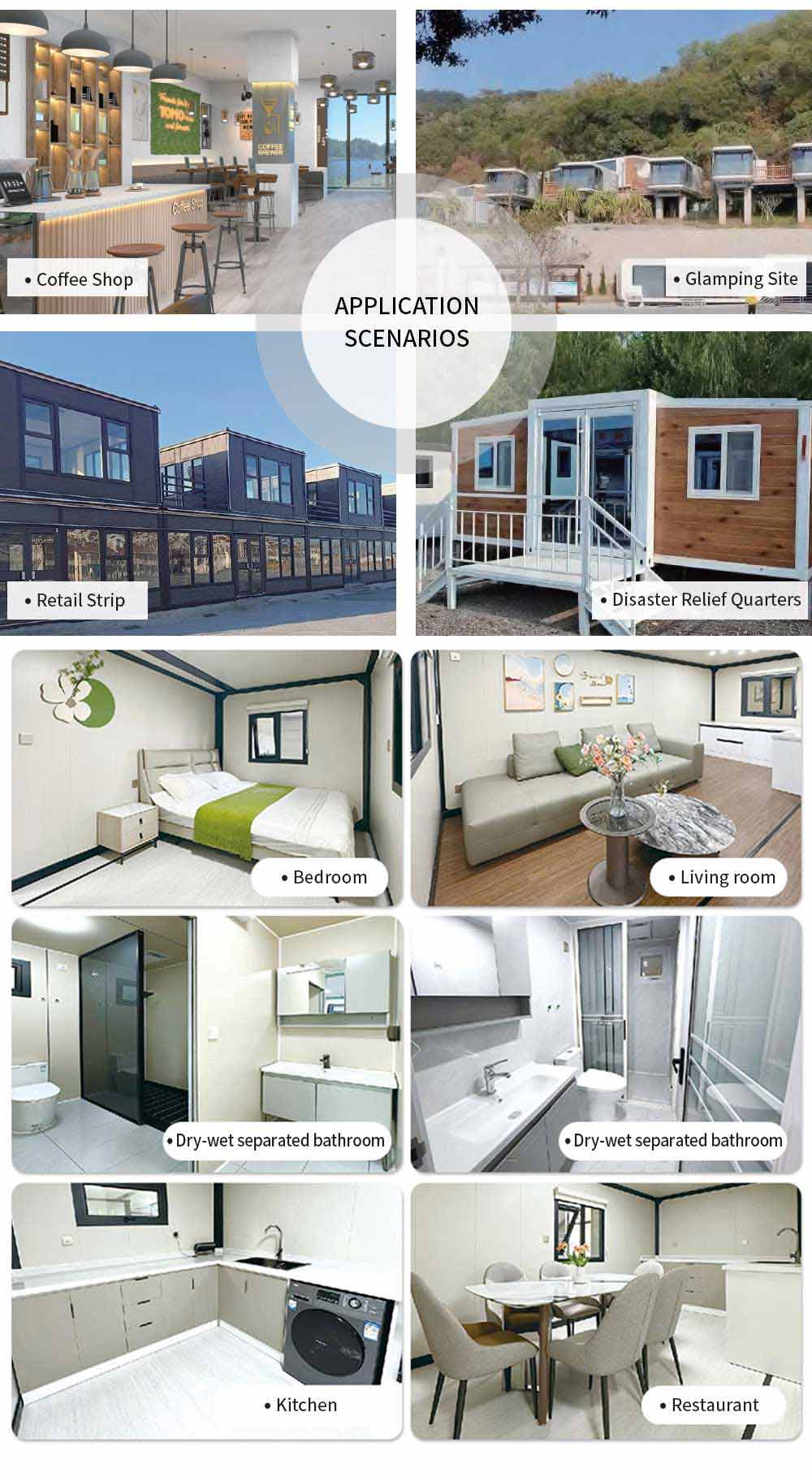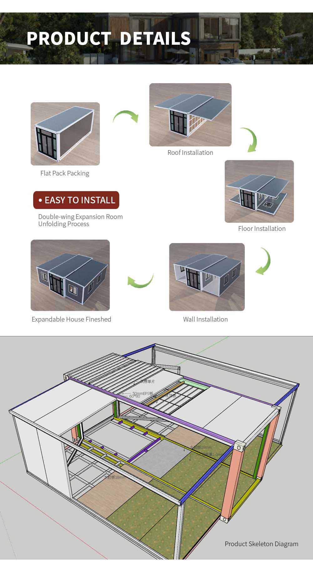 3mm Hot galvanized steel structure with 4 corner casts and (1)18mm fiber cement board; (2)1.6mm PVC flooring; (3)50mm rock woll ,eps or PU sandwich panel (4)Galvanized steel base plate.