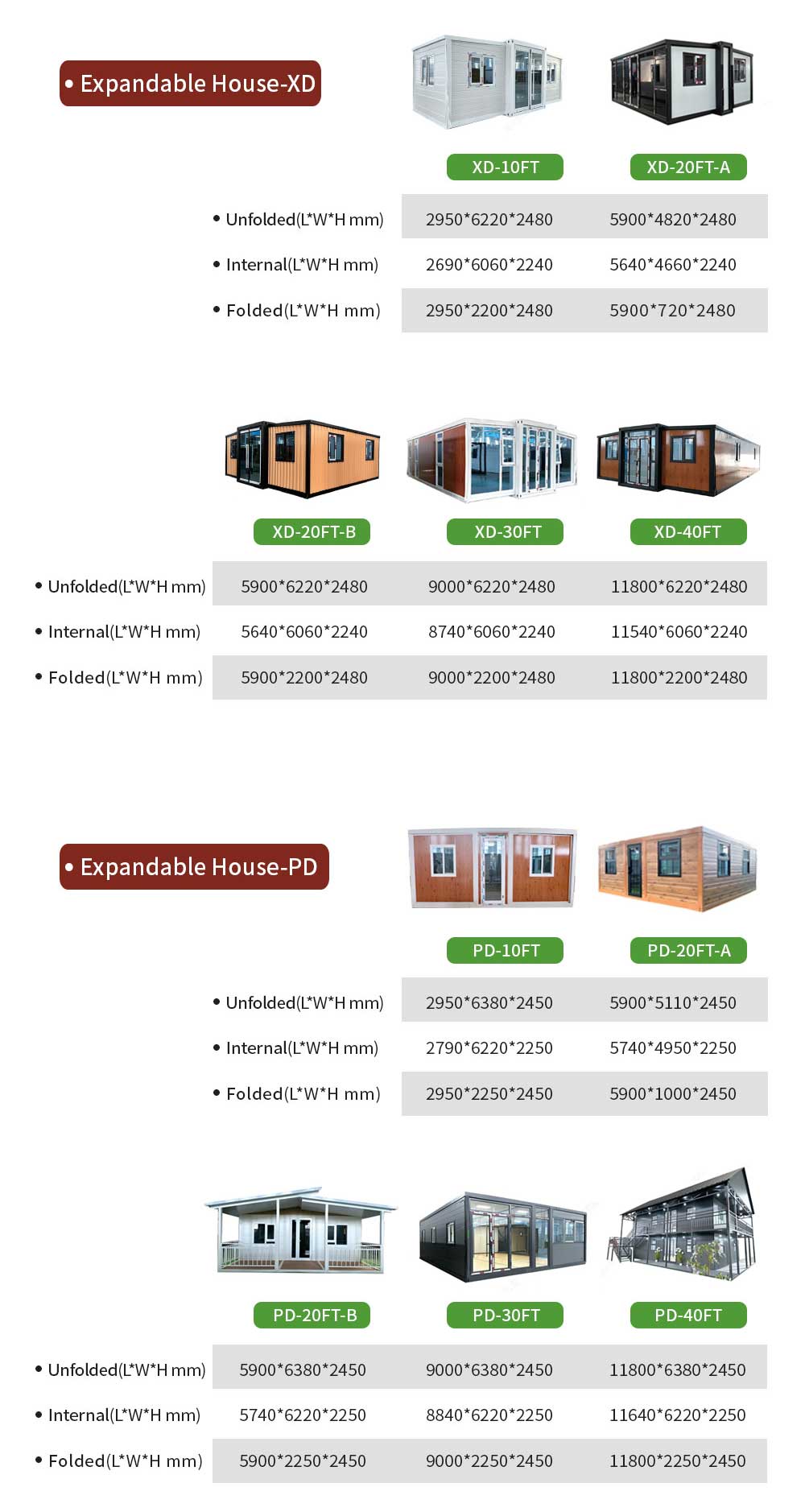 20ft,40ft,etc...We also had special size for 2.9M height